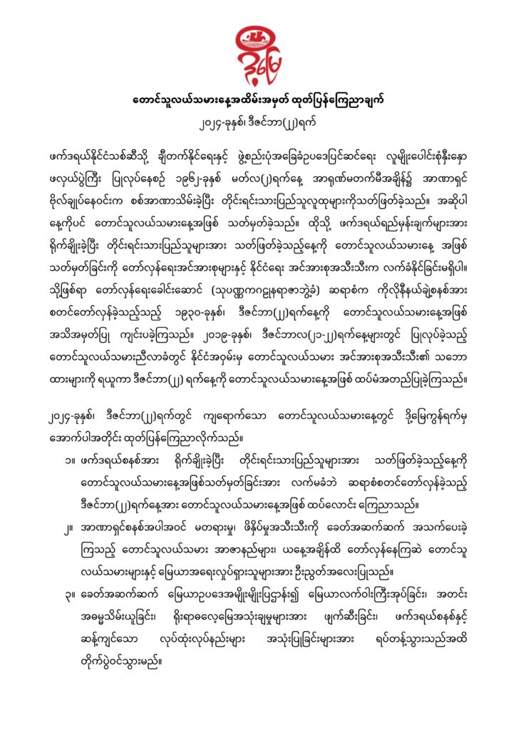 - ၁။ ဖက်ဒရယ်စနစ်အား ရိုက်ချိုးခဲ့ပြီး တိုင်းရင်းသားပြည်သူများအား သတ်ဖြတ်ခဲ့သည့်နေ့ကို တောင်သူလယ်သမားနေ့အဖြစ်သတ်မှတ်ခြင်းအား လက်မခံဘဲ ဆရာစံစတင်တော်လှန်ခဲ့သည့် ဒီဇင်ဘာ(၂၂)ရက်နေ့အား တောင်သူလယ်သမားနေ့အဖြစ် ထပ်လောင်း ကြေညာသည်။