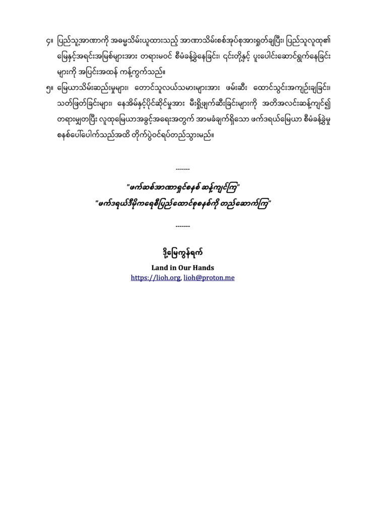 - ၄။ ပြည်သူ့အာဏာကို အဓမ္မသိမ်းယူထားသည့် အာဏာသိမ်းစစ်အုပ်စုအားရှုတ်ချပြီး၊ ပြည်သူလူထု၏ မြေနှင့်အရင်းအမြစ်များအား တရားမဝင် စီမံခန့်ခွဲနေခြင်း၊ ၎င်းတို့နှင့် ပူးပေါင်းဆောင်ရွက်နေခြင်း များကို အပြင်းအထန် ကန့်ကွက်သည်။