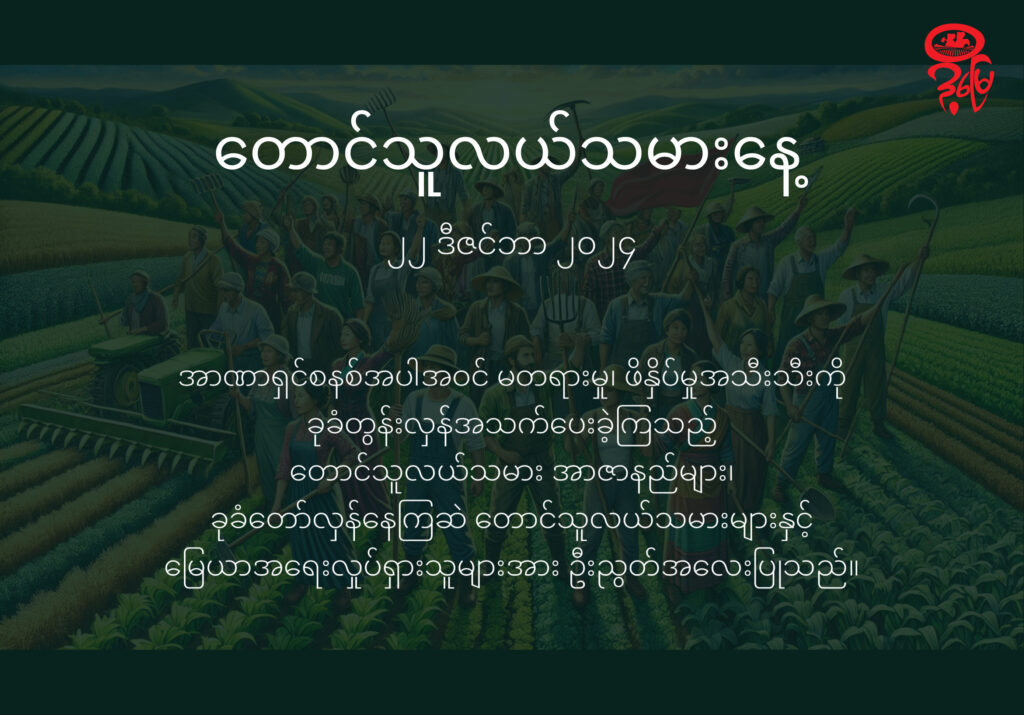On March 2nd of 1962, amidst the multi-ethnic conference for discussion on establishing a Federal Union and amending the Constitution, Dictator General Ne Win committed the Coup d’état and started massacre to the peoples; and marked that day as the Peasants Day (the Farmers Day). Revolutionary and political allies never accept the incidence including of marking the peasant day on the date that destroyed the federal visions and killed the peoples. Instead, December 22nd, which was the historical date of the peasant revolutionary leader Sayar San (Supannaka-Galuna-Raja), was recognized as the Peasants’ Day by the democratic allies, and revolutionary allies. The Assembly of the Peasants in 2019 affirmed that December 22 is the Peasants’ Day.