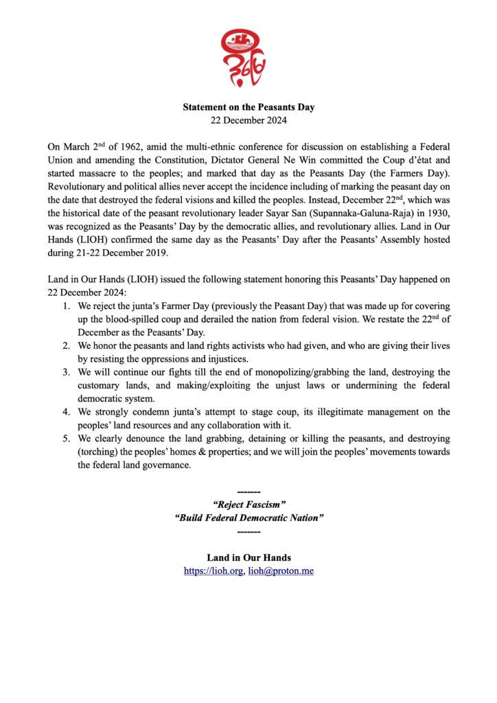 On March 2nd of 1962, amid the multi-ethnic conference for discussion on establishing a Federal Union and amending the Constitution, Dictator General Ne Win committed the Coup d’état and started massacre to the peoples; and marked that day as the Peasants Day (the Farmers Day). Revolutionary and political allies never accept the incidence including of marking the peasant day on the date that destroyed the federal visions and killed the peoples. Instead, December 22nd, which was the historical date of the peasant revolutionary leader Sayar San (Supannaka-Galuna-Raja) in 1930, was recognized as the Peasants’ Day by the democratic allies, and revolutionary allies. Land in Our Hands (LIOH) confirmed the same day as the Peasants’ Day after the Peasants’ Assembly hosted during 21-22 December 2019.